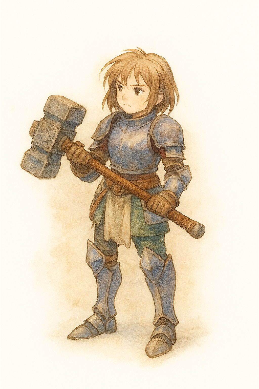 " 무기인 양손망치를 소환하는 갑옷입은 소녀"