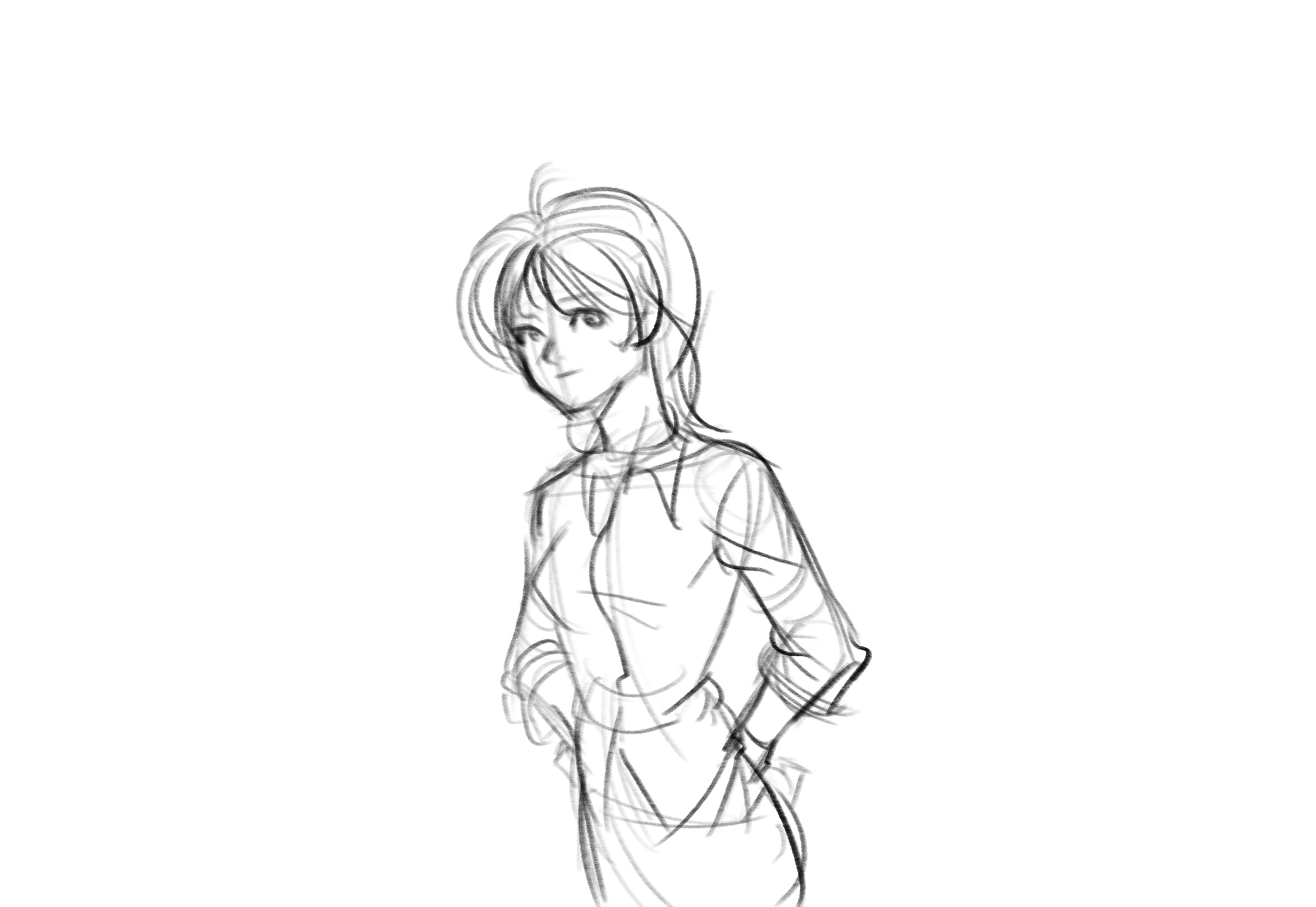 머리는 중간 길이의 갈색 머리이며 자연스럽게 흘러내려 이마를 덮고 있다